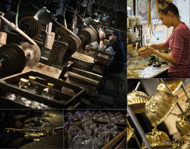开模压铸、零件准备、定位钻孔、风焊、抛光、电镀、封釉、电路装配、严格测试、配置水晶、成品检验、包装封箱