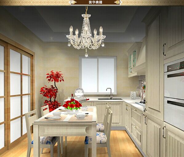 灶台上方一般设置抽油烟机,机罩内有隐形小白炽灯,供灶台照明。若厨房兼作餐厅,可在餐桌上方设置单罩单火升降式或单层多叉式吊灯。光源宜采用暖色白炽灯,不宜用冷色荧光灯。