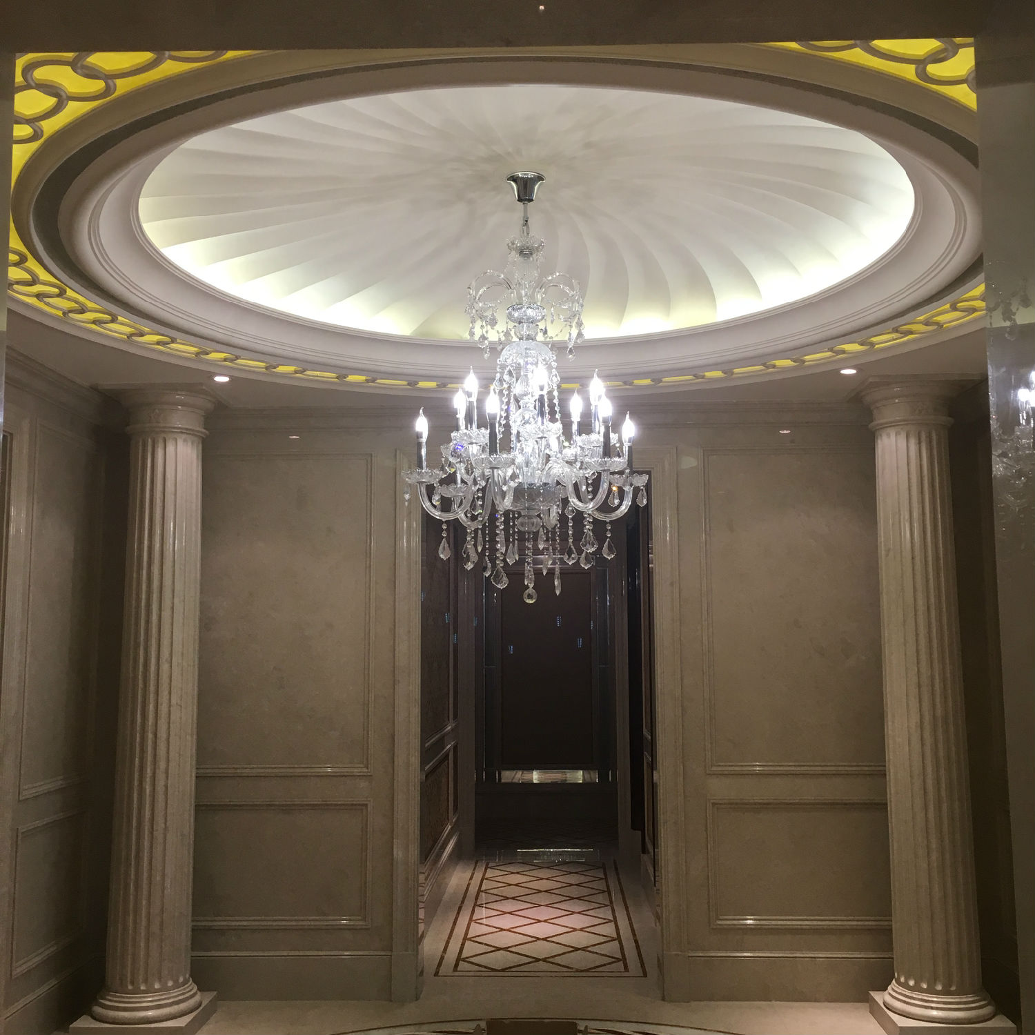 上图是房间走廊安装的小巧水晶吸顶灯,体型小巧,百搭款式,水晶透亮。下图出口处安放的水晶吊灯,金色金属搭配透明水晶,尽显品位。