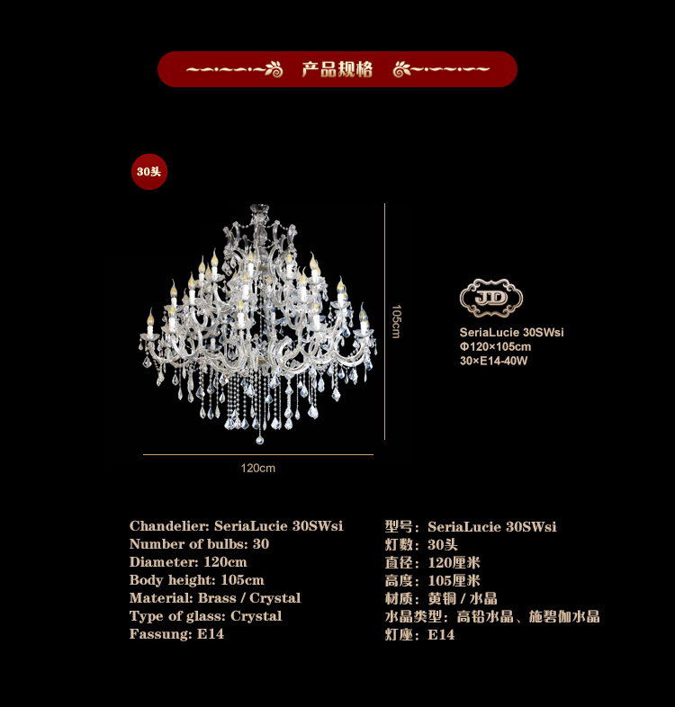 此款水晶灯由合金与水晶而成,合金为主,水晶为辅。银色合金灯架经久耐用,不用担心生锈或变形,优质的水晶制成的灯通、灯碟、弯管与串珠垂饰,进口之作,从中你看不到任何国产水晶的气泡或者磨损痕迹。灯身较大,照射范围较广,建议安装在空间较大的房间,例如别墅的大厅,酒店的大堂,亦或者是空间较大的套房客厅(视空间而定)。水晶材质可选三种:阿斯福水晶、施碧伽水晶与施华洛世奇水晶,三种水晶拥有的品质与光芒都是国产水晶无法媲美的。试想一下,大厅空旷,客厅冷清,装上它,是否有种画龙点睛之感。