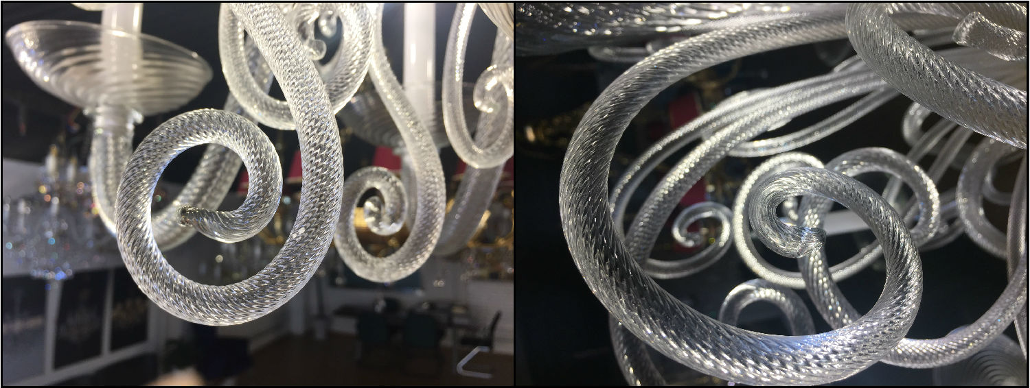 之前很多朋友都很疑惑为什么手工吹制玻璃灯价格这么贵,小编用一张细节图告诉你:经由手工制作出来的灯每个细节都不相同,比较直观的的灯臂尾端的弯钩弧度不一,可以说每一盏成品都是特别的。所以,你是愿意花少量的钱买廉价次品还是愿意花部分金钱购买艺术藏品呢?