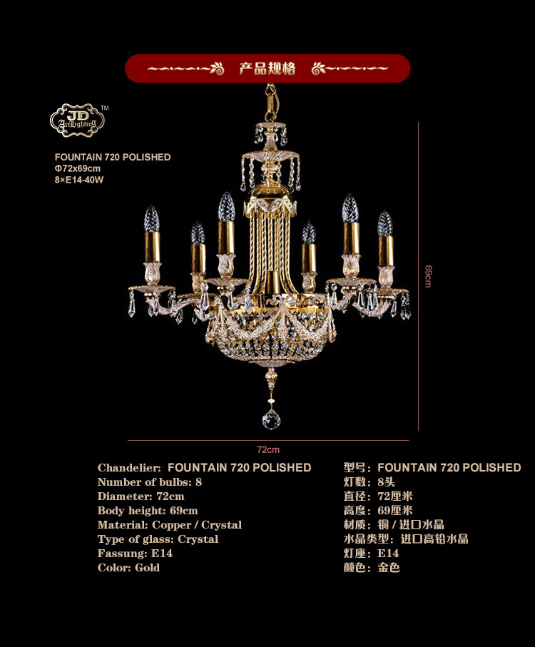 全铜水晶灯强调品味质感,使软装氛围变得更具气质,这款全铜水晶灯以优雅的品味、精美的造型吸引眼球,适用于小客厅、餐厅、卧室、书房等场所,营造出一个质朴优雅、古典优雅的欧式氛围。