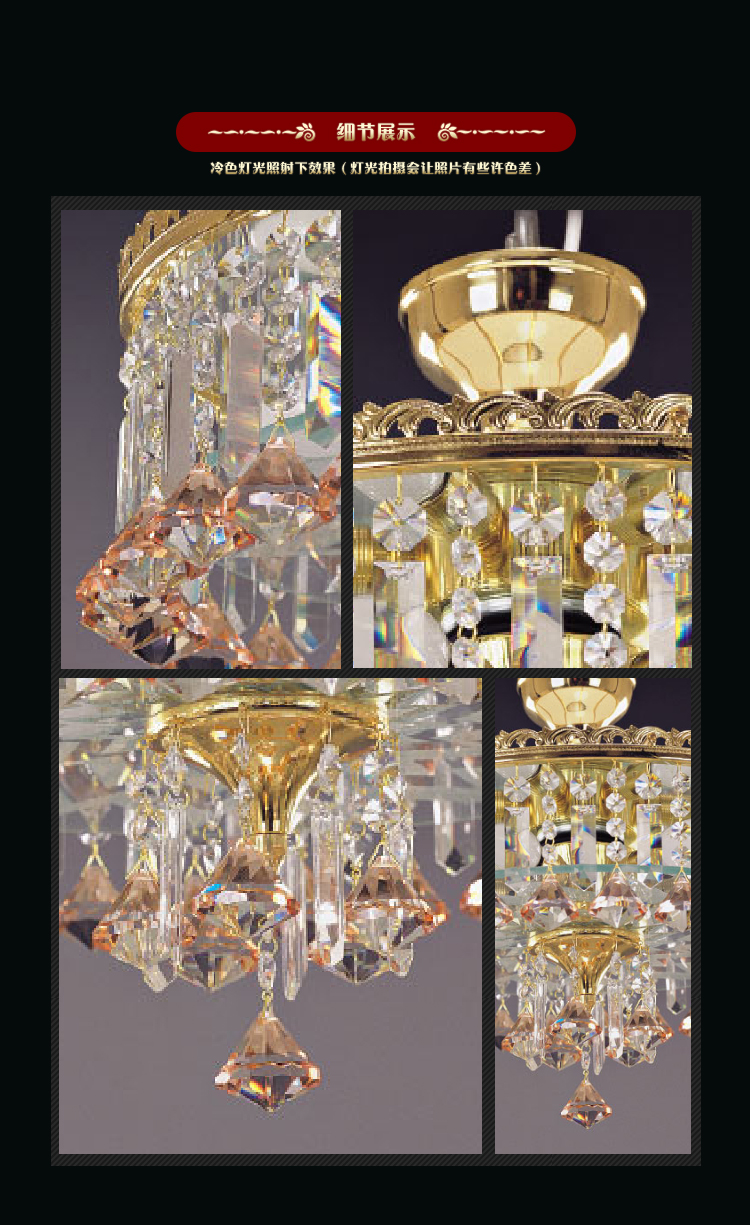水晶和全铜元件组合而成,水晶的作用已经与纯粹的水晶灯相比有了另外的含义。波浪形金属边框花纹,镜面金属底盘,这种水晶灯造型简洁、大方,即使大量使用到了水晶也依然散发着时尚的光芒。
