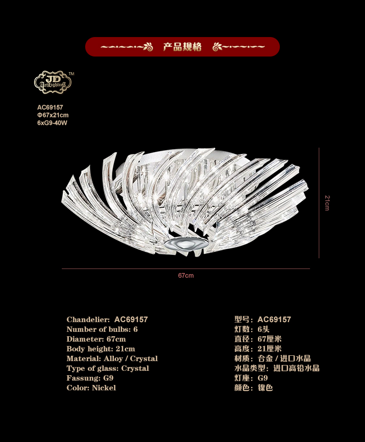 现代简约风,棱形的水晶通透而明朗,片片围城圆形的罩面简约而时尚,金色显奢华镍色先优雅,这是宝仕奥莎年度最后欢迎的一个系列灯具。